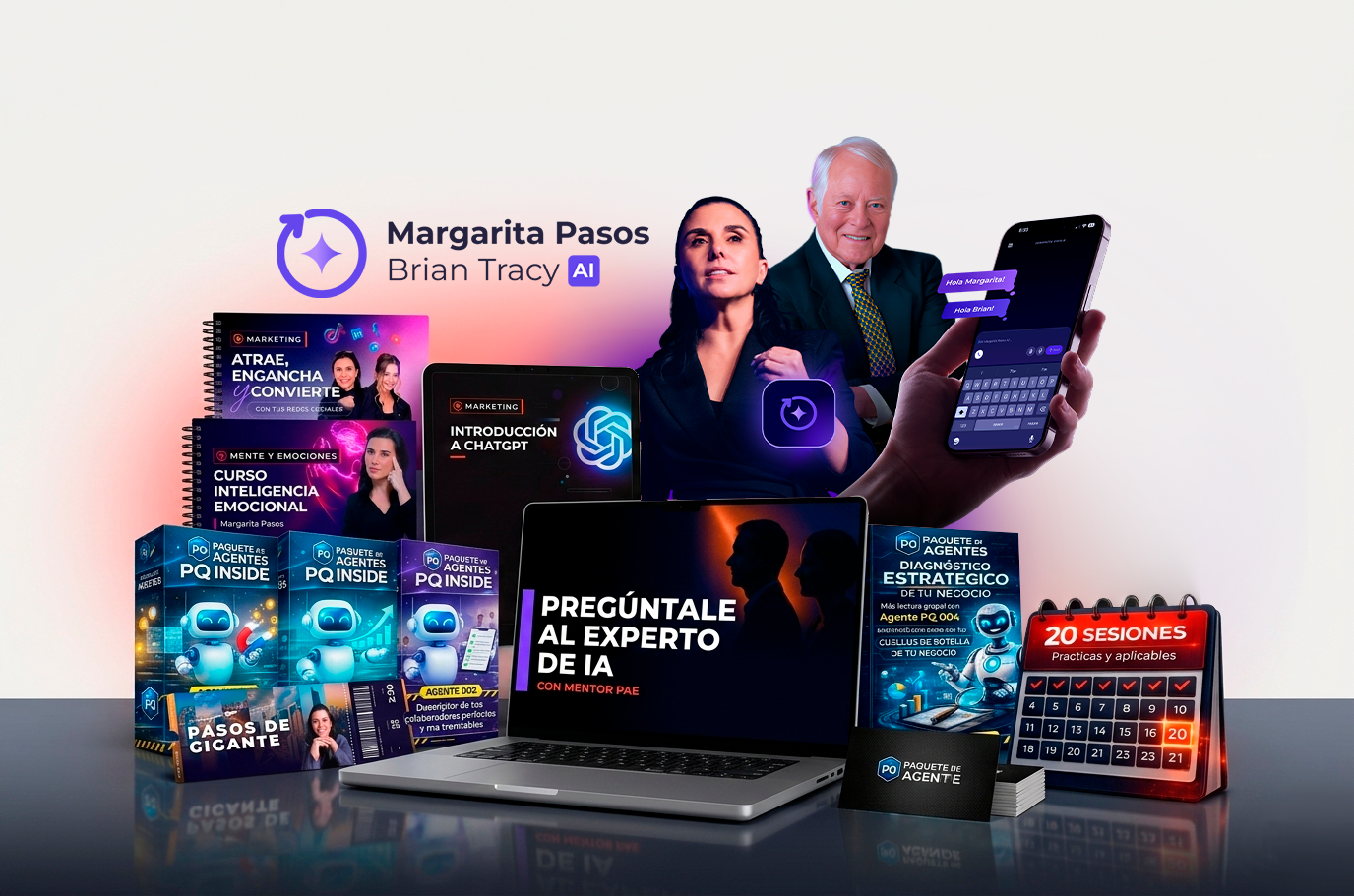 1) POTÉNCIATE CON MARGARITA Sesiones en vivo con Margarita (producto, liderazgo y mentalidad) potenciadas por Pasos Intelligence PQ (3 sesiones en vivo de 90 minutos + grabación) Valor:$3,500 USD